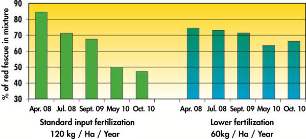 Years of independent research carried out by STRI, based in Bingley in the United Kingdom, have shown that red fescue and hard fescue perform excellently on lawns and golf courses under low to very low input fertilisation. The research showed that the quality of the grass cover remained the same when fewer fertilisers were used. Mixtures and cultivars with a low input (60 kg N/ha/year) were compared with those with a standard input (120 kg N/ha/year). The research paid attention to the influence of less fertilisation on disease resistance, the development of annual meadow grass, turf density and also ball speed (including golf ball speed) and build-up of thatch on the turf. The research, which took several years, also demonstrated that, compared with the standard regime, the proportion of red fescue increased over the years when input was lower.