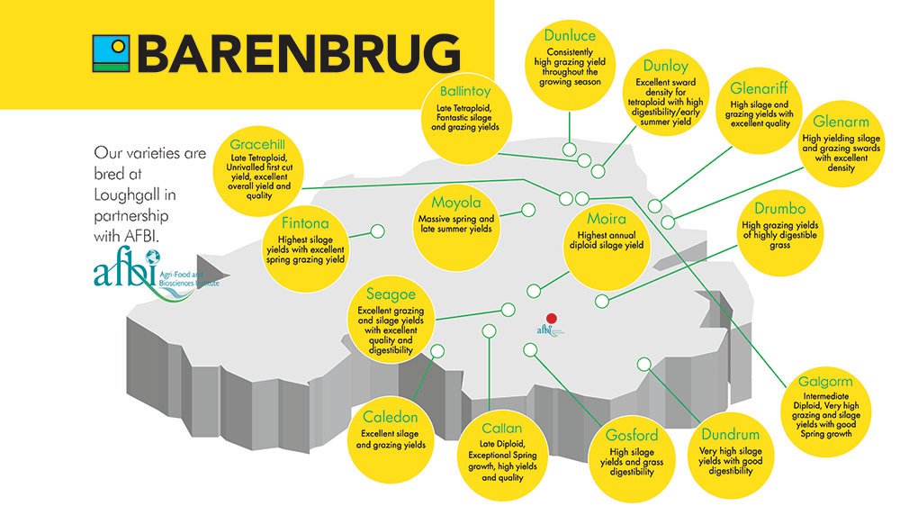 To get 2020 off to a flying start, please see below details of our grass varieties for 2020, bred on your doorstep at AFBI Loughgall. This year, we are delighted to launch the new late Diploid Perennial Ryegrass, Callan. Callan has been bred as a replacement for the familiar variety, Tyrella and will bring excellent Spring growth coupled with high annual yields and nutritional quality. With an already impressive portfolio of AFBI bred grasses in our mixtures, Callan only strengthens our commitment to providing the best swards for local farmers.