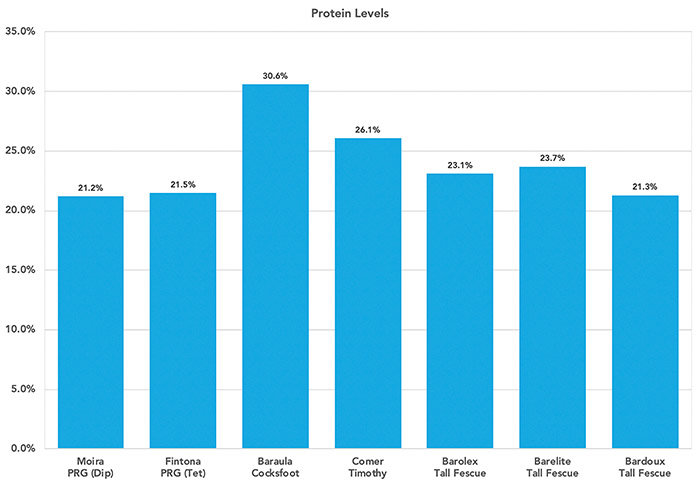 Above: Protein levels tested at Barenbrug’s Cropvale site on 20th March 2020. All species had protein levels of over 21% with cocksfoot being the highest at 30%.