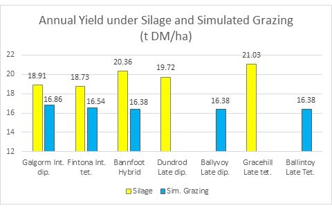 Caledon (intermediate tetraploids) Ballyvoy, Dundrod (late diploids) and Gracehill (late tetraploid) all showed high protein levels under simulated grazing, averaging over 20%CP on average between April and May.