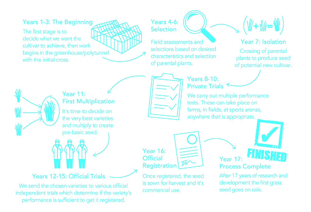 Find out how the 15-year process of bringing new grass varieties to British farms, greens and...