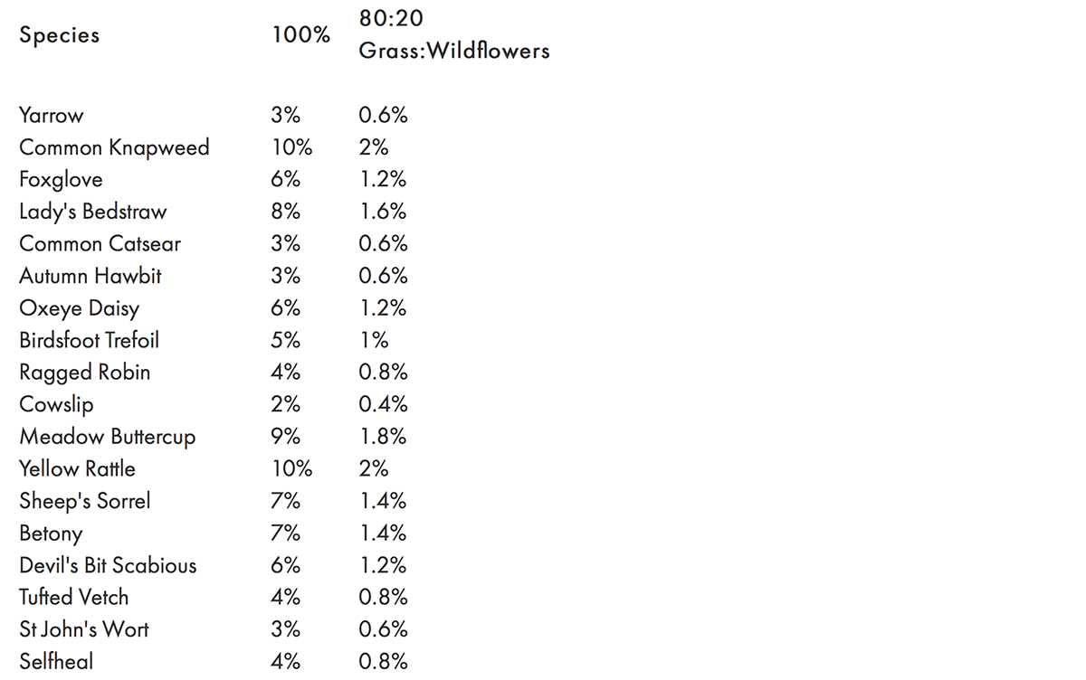 When choosing 80:20 Grass:Wildflowers, the mixture contains a rich blend of grasses, formulated to compliment the wildflower species. The grass blend contains slow growing species which will not compete against the slower growing wildflowers. Some of the grasses included in the mixtures are quite rare, such as Meadow Foxtail and Sweet Vernal. Soil type specific mixtures also contain grass species that are indicative of that particular habitat, such Wavy Hairgrass in the acid soils mixture and Wood Meadow Grass in the woodland edge mixture.