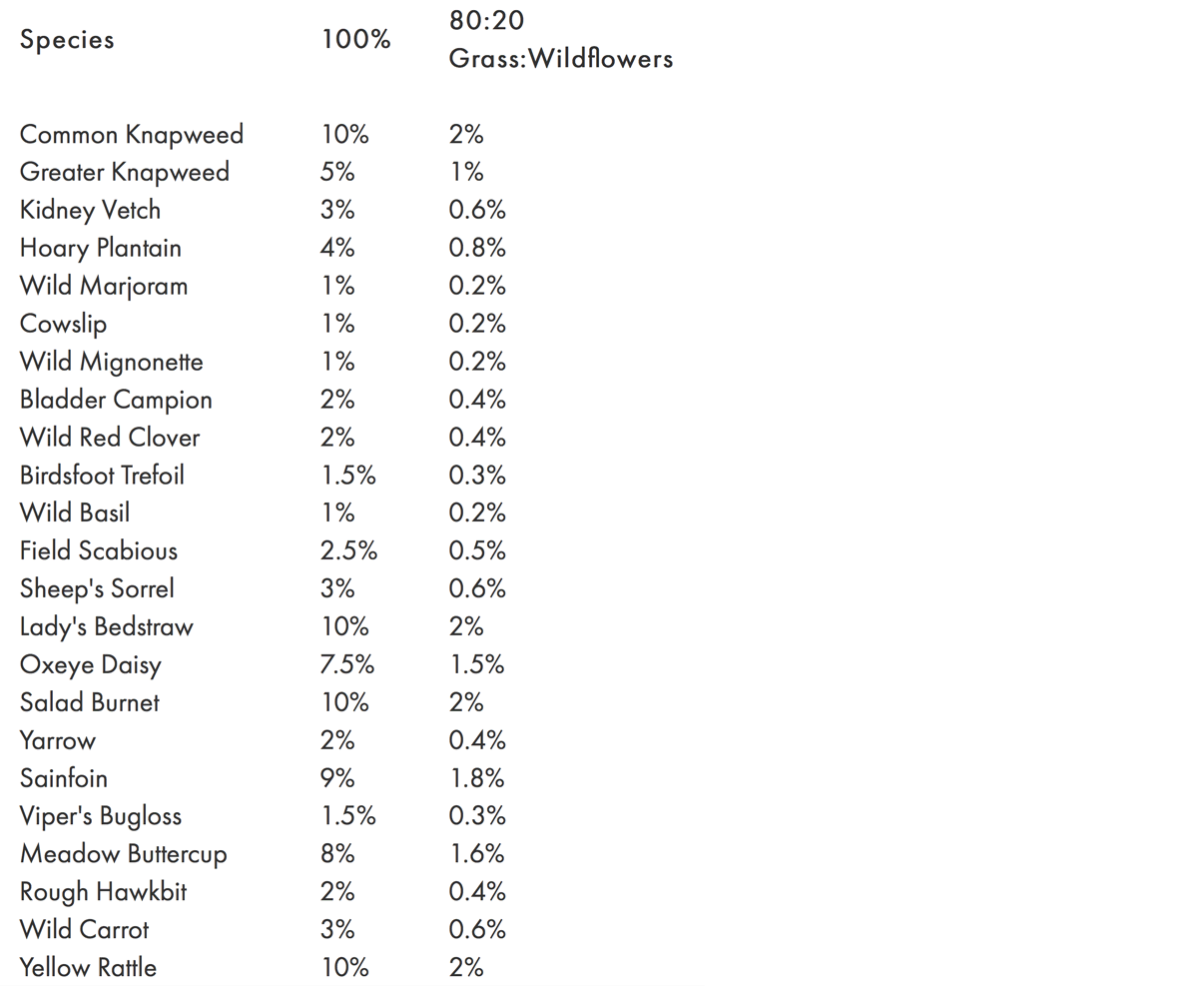 When choosing 80:20 Grass:Wildflowers, the mixture contains a rich blend of grasses, formulated to compliment the wildflower species. The grass blend contains slow growing species which will not compete against the slower growing wildflowers. Some of the grasses included in the mixtures are quite rare, such as Meadow Foxtail and Sweet Vernal. Soil type specific mixtures also contain grass species that are indicative of that particular habitat, such Wavy Hairgrass in the acid soils mixture and Wood Meadow Grass in the woodland edge mixture.