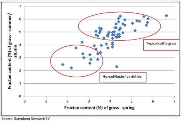Low fructan content Barenbrug has undertaken a lot of research into the fructan (sugar) contents of different grasses. Some grass species are known for their low fructan contents, but even within a species, some varieties contain more fructan than others. The varieties in Horse Master contain an impressive 50% less fructan than varieties of grass intended for cattle and sheep. |