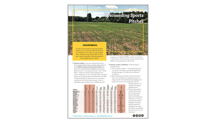 1. Choose wisely. If you are maintaining winter sports pitches then look no further than table S1 in the BSPB Turfgrass Seed Booklet 2020 (see below). It ranks perennial ryegrass cultivars by Mean Score of “Live Ground Cover” and “Visual Merit”, based on artificial wear applied over winter. However, do not overlook other important traits such as Spring Recovery, Resistance to Red Thread and Colour). Ensure your mix contains varieties on this list and you source it from a reputable seed company. Our 100% perennial ryegrass mix, MULTI SPORT, contains 4 cultivars in the top-16 of this list with a mean score of 7.52 AND it is all produced on UK farms!