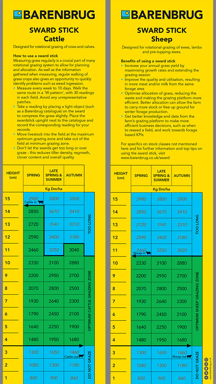 Rotation lengths will vary dependant on the time of year, class of stock, the weather, climate and topography etc. but the key is to be entering and exiting livestock into a field at target heights to maximise yields, quality and utilisation. Use the suggested optimum grazing zone, for your specific livestock, as the indication of when to put your livestock in to the field (between 11-15cm) and always ensure the livestock come out of the field at the minimum, acround 3cm.