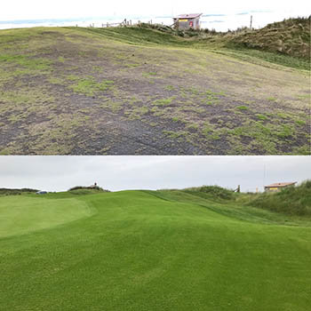 “It was particularly hard to take as we’d put a lot of effort into the hole the previous winter after a redesign with golf course architects Mackenzie & Ebert. We knew we had to call the experts in,” says Ivamy. “David Greenshields from Barenbrug visited us and recommended oversowing with ryegrass. Although this was unconventional, we both agreed it was the best approach. With cooler temperatures than normal for this time of year, ryegrass varieties such as Barolympic have the benefit of growing at temperatures as low as 4°C and are also salt tolerant. If the rye became a problem for us we would spray it out with a graminicide at a later date, but so far this hasn’t been the case”