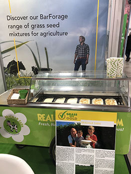 Our new design stand was well received and complimented on at the Winter Fair and of course, the return of Braemar Farm with their artisan ice cream was a major hit with young and old! Braemar Farm are our Grass Into Gold partner in Northern Ireland and the Winter Fair is a great chance to showcase the farming success story of husband and wife team, Ian & Ruth Pollock. Ian runs their dairy farm near Castlerock, Co. Londonderry and Ruth uses her skills to produce ice cream from the milk produced on the farm. With Barenbrug grass mixtures used at Braemar farm, this is an ideal example of delicious produce direct from grass to fork (or in this case spoon!). Ruth was on hand at the Winter Fair to give visitors to our stand a Braemar Farm ice cream compliments of Barenbrug and as always, it went down a treat.