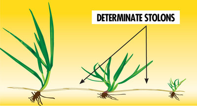 The determinate stolons are growth shoots emerging from auxiliary buds at the base of each plant. When an RPR plant is damaged, creating space, determinate stolons will grow horizontally into the empty space and develop roots. Each RPR plant connects to other plants and into the top layer of the soil; this produces a network of stolons.