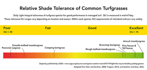 Recent data from the USGA suggests browntop (colonial) bentgrass is superior to creeping bentgrass in performance under low light or shade conditions. This correlates with 7-8 weeks of additional optimal light conditions for browntop in the UK, compared to creeping bentgrass.