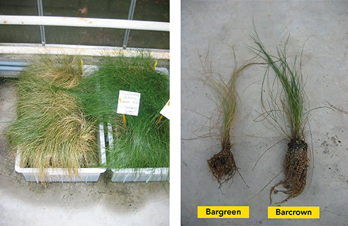Pictures 1 & 2: Glasshouse salt tolerance trial on three month old established plants at Barenbrug Research. Chewings fescue (left) versus slender creeping red fescue (right) at 30,000ppm salt water irrigation over a period of three months.
